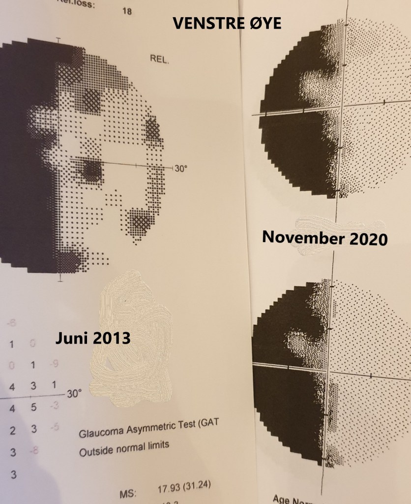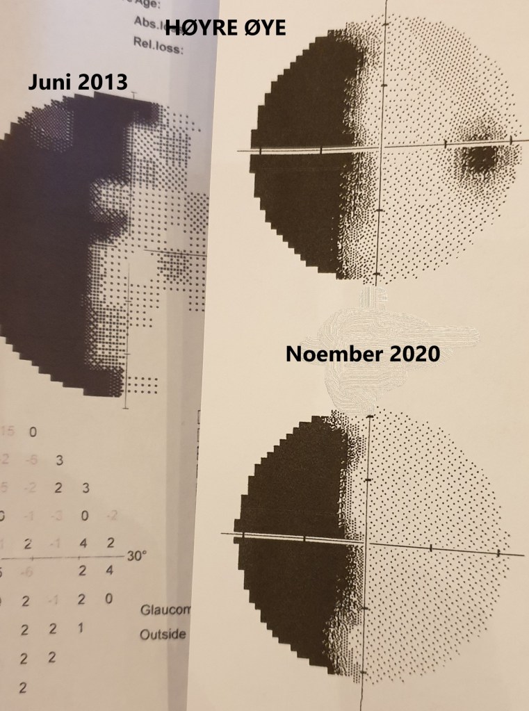 Ett år etter operasjonen min, tok jeg en synfelttest hos optikeren, hvor de da så hvor mye av synsfeltet som var borte. I år ønsket synspedagogen at jeg skulle ta en ny test, 7 år etter. Ut i fra den øvingen jeg gjorde hos henne, kunne vi bare se sånn ca hvordan utfallet mitt er nå. I slutten av november trappet jeg både nervøs og spent opp hos optikeren. Spent for å se om øvingen hadde hjulpet. Nervøs, fordi under øvingen hos synspedagogen var det enkelte ganske åpenbare lys jeg burde ha sett, som jeg ikke så, og det skremte meg. Spesielt som hypokonder. Kunne jeg ha fått en øyesykdom som reduserer synsfeltet? Da vi begynte testinga var jeg så nervøs at jeg satt med skuldrene helt oppunder ørene, og jeg var så kvalm at jeg trodde jeg skulle kaste opp. Jeg fortalte optikeren at jeg var så nervøs. Hun så på de testrundene vi hadde tatt, og kunne berolige meg med at dette så ikke så verst ut. Det roet meg ned såpass at jeg klarte å gjennomføre resten av testen. Da optikeren fikk sammenlignet dagens test med testen jeg tok i 2013, kunne hun umiddelbart se at synsfeltet mitt hadde blitt bedre. Mye bedre. Der hvor synsfelttapet mitt krysset midtlinja i 2013, hadde det nå trukket seg tilbake. Dette var helt fantastiske nyheter. Både optikeren og jeg var i ekstase. I bilen på vei hjem satt jeg med tårer i øynene. Det var så utrolig deilig å få en bekreftelse på at det jeg har gjort virket. Alle dager med trening. Alle ganger jeg har måtte overhøre stemmen «åh, synstrening – gidder jeg det i dag?». Nå kom belønningen for å være sta og gjøre det som ikke alltid er gøy, men bare må gjøres. En ting du ikke ser fysisk resultat av. F.eks ved styrketrening ser du den fysiske framgangen, i form av muskler, klarer mer vekt. Men når det gjelder sidesyn, klarer jeg ikke å se det. Jeg har til tider følt at jeg kanskje enser noe mer til venstre, men det var ikke noe håndfast. Nå fikk jeg det.